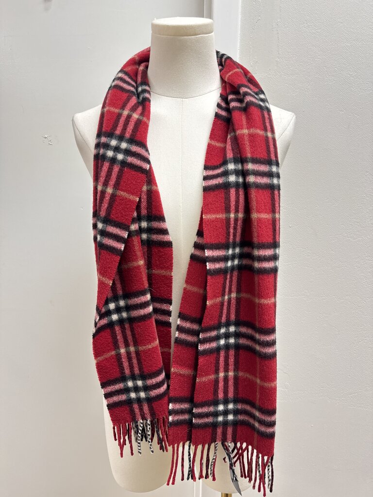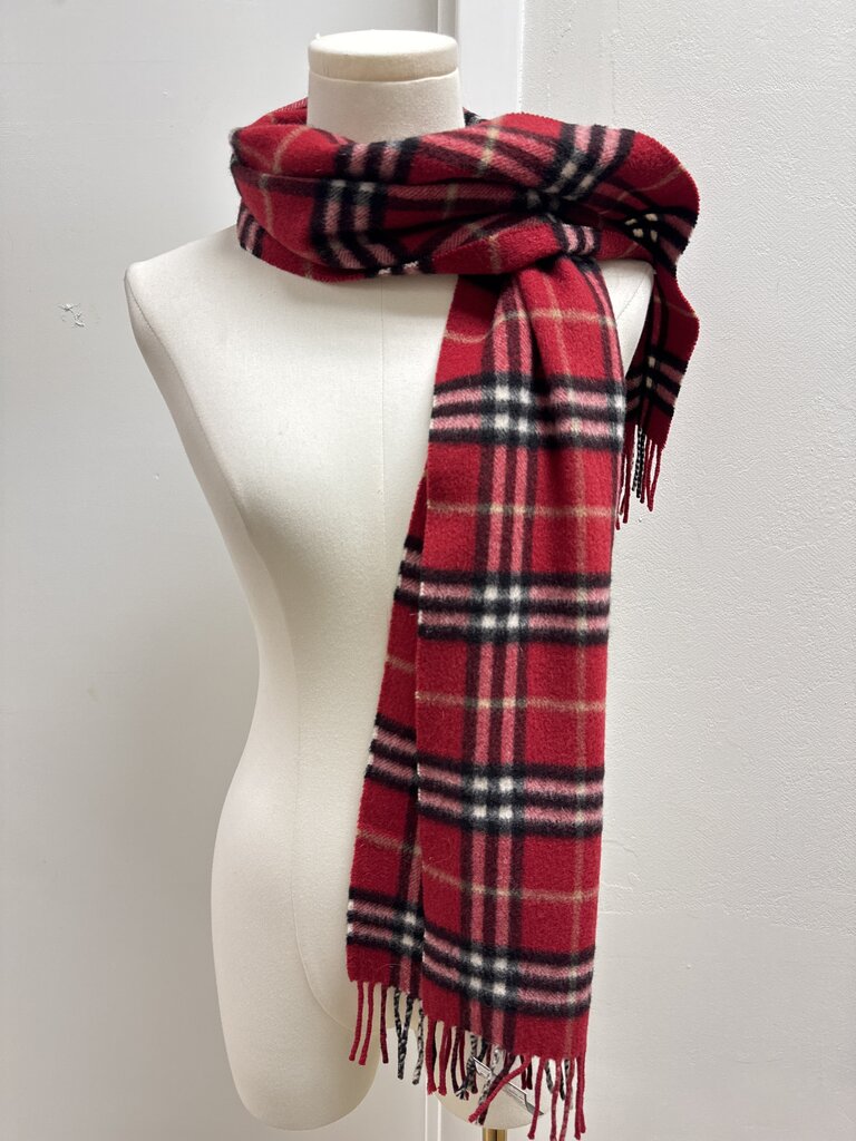 Burberry Red Plaid Cashmere Fringe Scarf